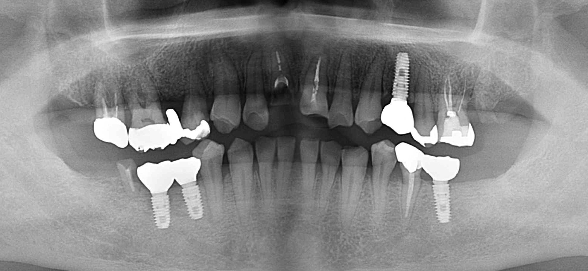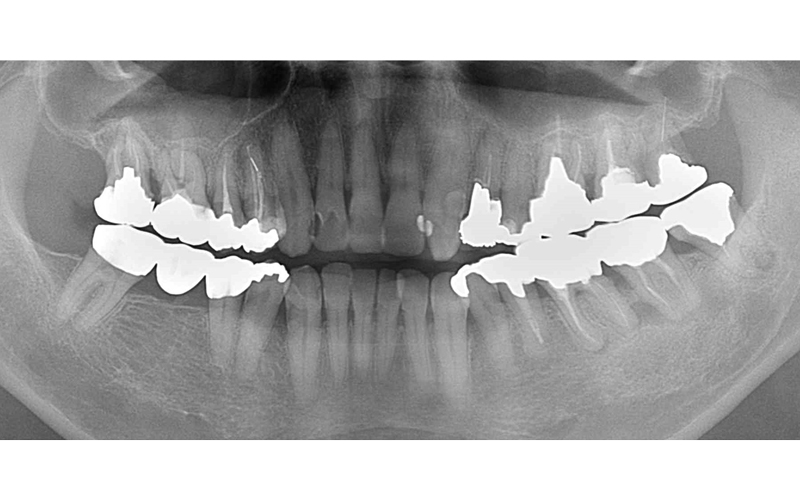 | 備考 | 初診時、以前義歯を製作して貰ったみたいですが使用しておらず、奥歯で咬んでいない状態で来院。前歯が前方に出ているのが気になるとの事でした。 右上の端の歯は根の病変で保存不可能の状態でした。前歯の治療を含め奥歯にインプラント治療を選択しました。 |